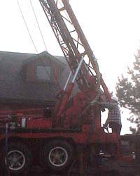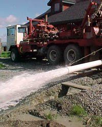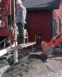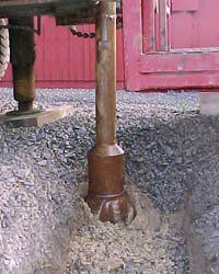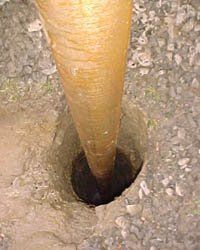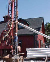 After the bore hole is drilled, casing is placed down its center. The bottom lengths of casing are perforated and screened to allow the water to flow inside them. #6 Well Pack gravel is packed around the casing to a level of 50 feet from ground level. The top 50 feet are filled with cement to seal the well from surface contaminants.